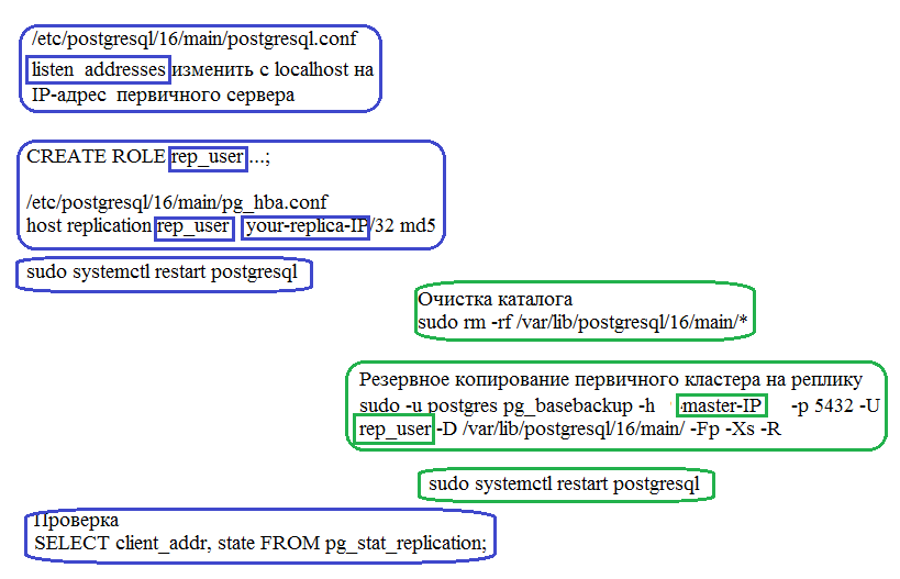 Шаг 1 Настройка первичной базы данных для принятия подключений sudo nano /etc/postgresql/16/main/postgresql.conf listen_addresses и измените ее значение с localhost на IP-адрес первичного сервера Шаг 2 – Создание специальных прав с разрешениями на репликацию в psql из под postgres CREATE ROLE rep_user WITH REPLICATION PASSWORD 'rep_userXXXX' LOGIN; sudo nano /etc/postgresql/16/main/pg_hba.conf Добавьте следующую строку в конец файла pg_hba.conf: host replication test your-replica-IP/32 md5 sudo systemctl restart postgresql@12-main |