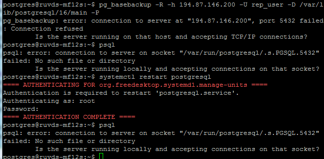 Шаг 3 – Резервное копирование первичного кластера на реплику sudo rm -rf /var/lib/postgresql/16/main/* На реплике! А не на главной. М.б. поэтому ошибка была sudo -u postgres pg_basebackup -h 194.87.146.200 -p 5432 -U rep_user -D /var/lib/postgresql/16/main/ -Fp -Xs -R Из под sergsavin запустил пароль rep_user ошибка - не пустой каталог /var/lib/postgresql/16/main/ cd /var/lib/postgresql/16/ sudo -u postgres rm -r main sudo -u postgres mkdir main sudo -u postgres chmod 700 main |