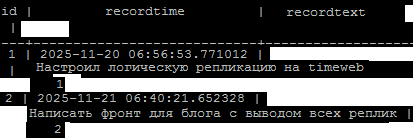 psql CREATE DATABASE db_test; Полезная инструкция timeweb переключиться на другую базу данных внутри psql используем команду: \c имя_БД Создал таблицу themes 1. Брандмауэр - пока не трогал 2. Настройки Master Реплицировать будем базу с названием db_test. (и для того чтобы не корёжить имеющиеся БД на timeweb) /etc/postgresql/16/main/postgresql.conf SHOW hba_file; /var/lib/pgsql/16/data/pg_hba.conf (?) host db_test postgres 192.168.1.11/32 trust host postgres postgres 192.168.1.11/32 trust Свои данные, конечно |