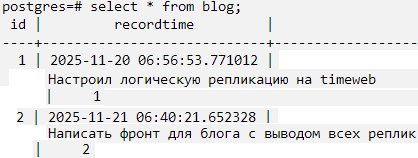 На реплике Создал на timeweb БД db_test и пустую таблицу themes CREATE SUBSCRIPTION sub1 CONNECTION 'host=IP Мастера dbname=db_test application_name=sub1' PUBLICATION pub1; Всё ок