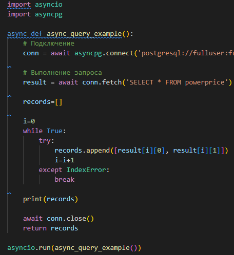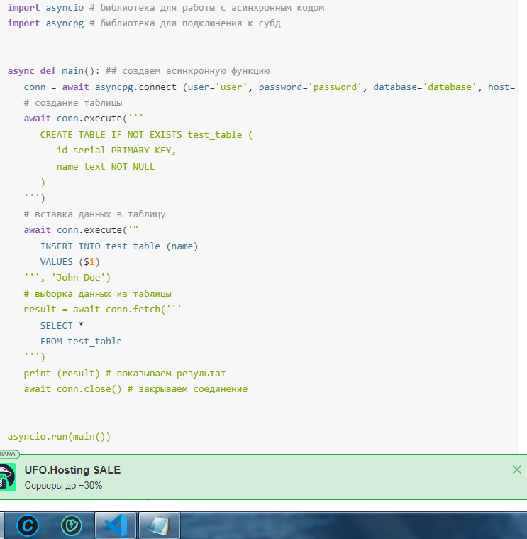 conn = await asyncpg.connect (user='user', password='password', database='database', host='host') # подключаем к субд
